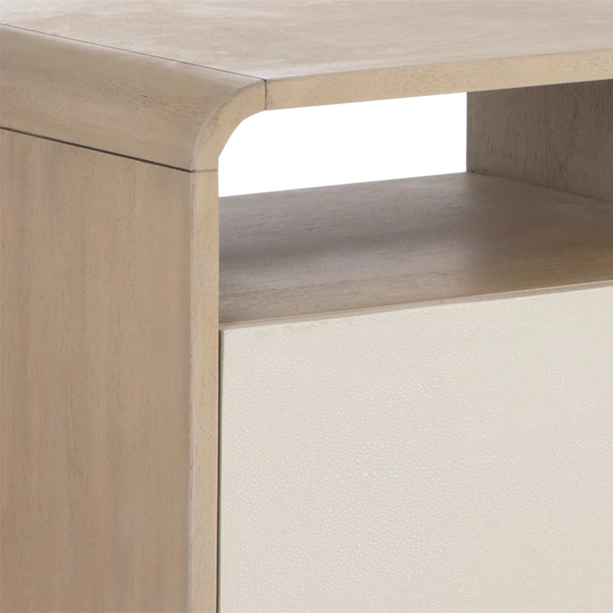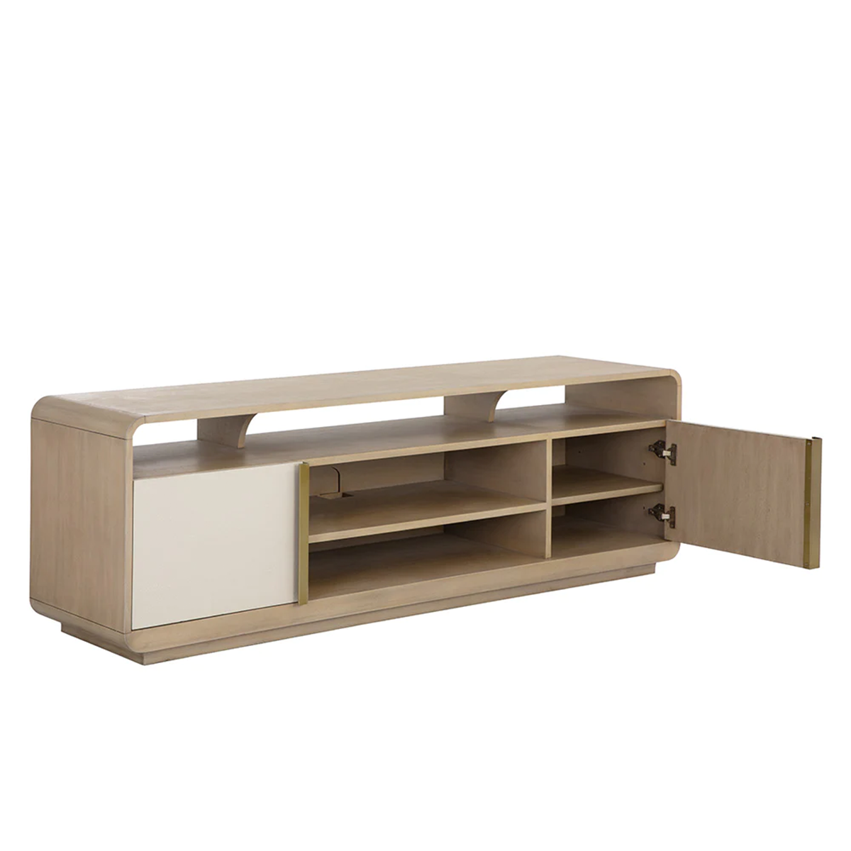 وحدة تحكم وخزانة وسائط كلاسيكية توفر مظهرًا كلاسيكيًا وخالدًا بحوافها الناعمة المستديرة. مصنوعة من خشب السنط الخفيف مع خزانتين ملفوفتين بجلد كريمي اللون. مكتمل بأجزاء معدنية نحاسية عتيقة.